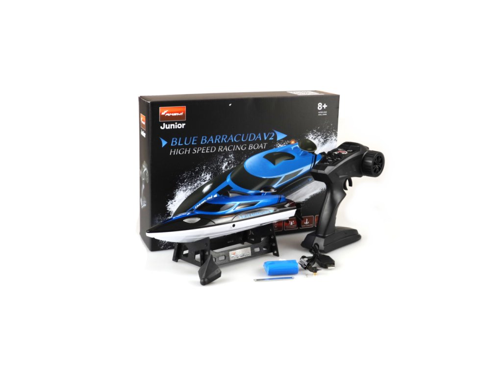 Populární závodní loď základní úrovně byla v mnoha oblastech opět vylepšena. Ideální pro malé vodní plochy. S LED osvětlením vpředu i vzadu pro lepší orientaci a viditelnost. Zážitkem je i jízda za šera. Světla lze zapínat a vypínat pomocí moderního dálkového ovladače 2,4 GHz, který se snadno drží. Zcela přepracován byl také trup. Nyní má dvojité těsnění (2 víčka) a nyní ještě účinněji chrání před vniknutím vody. Člun je odolný proti převrácení. Díky ergonomické a promyšlené konstrukci trupu klouže loď velmi hladce a elegantně po vodní hladině. Člun dokonce dosahuje úžasné rychlosti až 25 km/h. Elegantní, nadčasový design a linie bez ozdůbek. Blue Barracuda V2 má také ochrannou funkci proti náhodnému spuštění výkonného motoru z vody. Výstražná funkce integrovaná ve vysílači, pokud dojde k překročení dosahu. Pozoruhodné na tomto modelu je také plně proporcionální dálkové ovládání (umožňuje citlivé řízení a akceleraci). Vyzdvihnout je třeba i vodní chlazení, které je již standardně instalováno a je pro tuto třídu lodí neobvyklé. To znamená, že tato závodní loď zůstane vždy „v pohodě“ i při delších výletech na plný plyn a v létě.